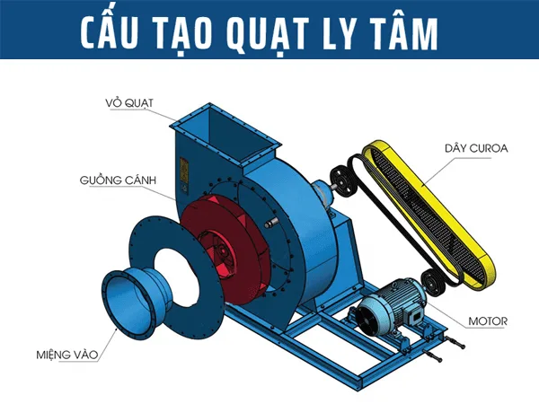 Về cơ bản, cả quạt hút ly tâm và quạt thổi ly tâm đều có cấu tạo tương tự, gồm thân quạt, cánh quạt, động cơ điện và vỏ bảo vệ. Cánh quạt ly tâm có thể thiết kế cong về trước, cong về sau hoặc thẳng, giúp điều chỉnh lưu lượng, áp suất và hiệu suất vận hành. Vỏ quạt thường được thiết kế dạng ốc hoặc tròn, dẫn hướng dòng khí ra ngoài, giảm tổn thất áp suất. Động cơ điện có thể gắn trực tiếp hoặc qua hệ thống dây đai, điều khiển tốc độ quay của cánh quạt.